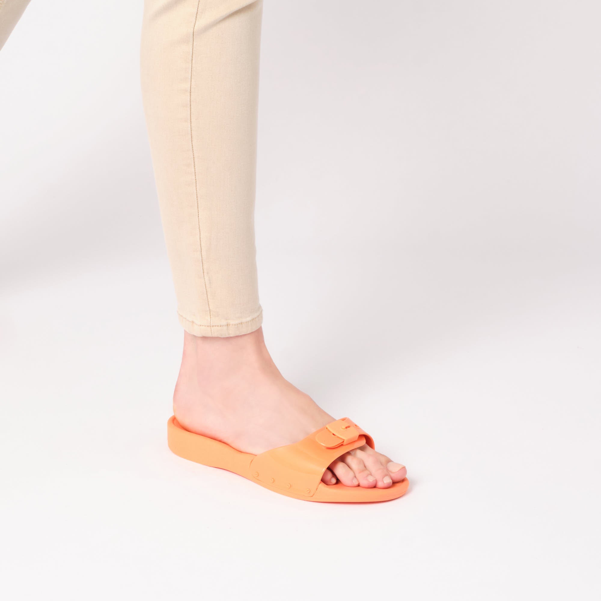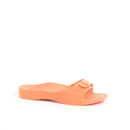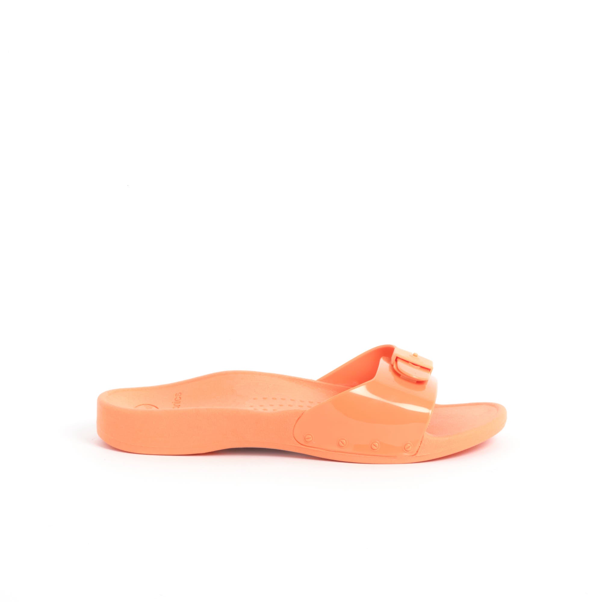 The colourful Scholl Sun slippers are characterised by a PVC upper and a Biomechanics® technology footbed. The anatomical shape of the Triplanar control system footbed makes it possible to improve the posture and the alignment of the foot, providing the utmost comfort. The tonal buckle makes it possible to adjust the upper to the shape of the foot. The surface of the insole has been designed so as to reduce the possibility of feet slipping, even when wet. The sole is slip-resistant. Made in Italy.