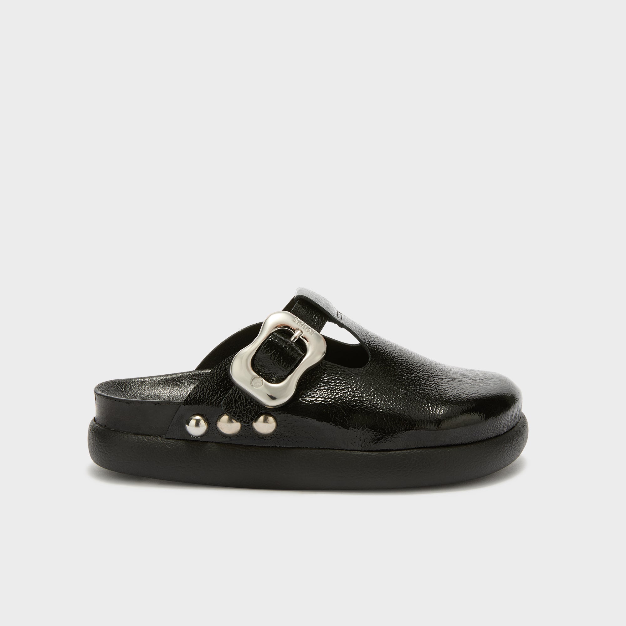 These mules feature a chunky sole for added height and comfort, paired with a smooth leather upper that ensures a refined yet modern look. A large buckle detail enhances the design, while three metallic studs on the outer side offer a contemporary twist to the classic mule silhouette.