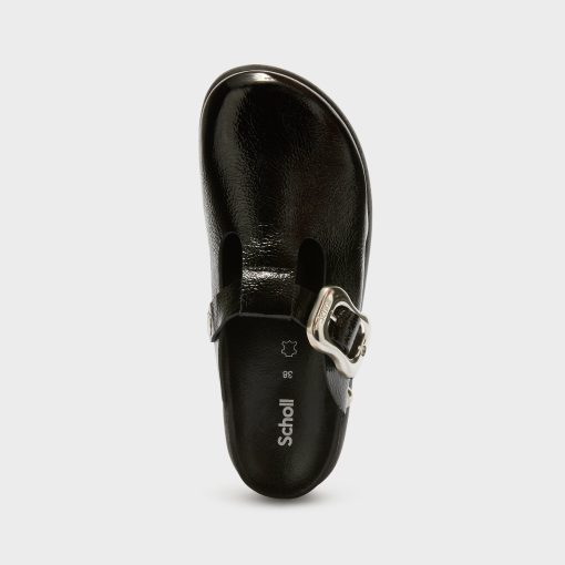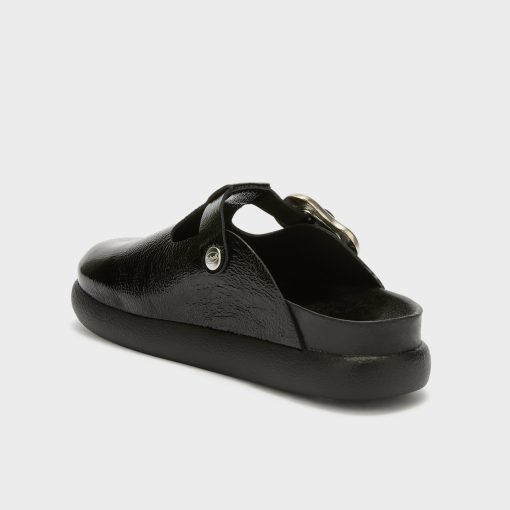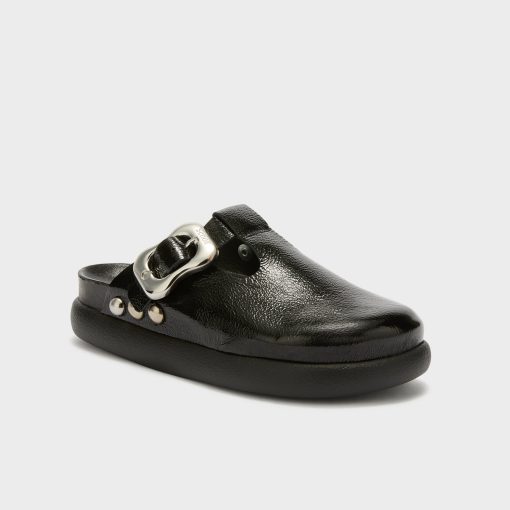 These mules feature a chunky sole for added height and comfort, paired with a smooth leather upper that ensures a refined yet modern look. A large buckle detail enhances the design, while three metallic studs on the outer side offer a contemporary twist to the classic mule silhouette.