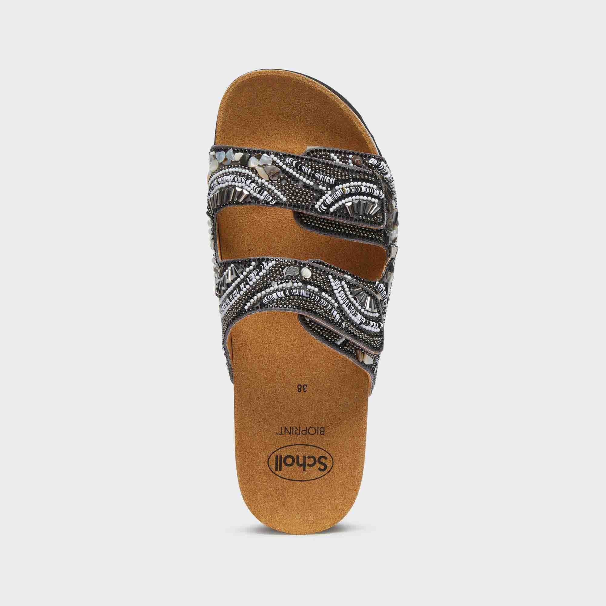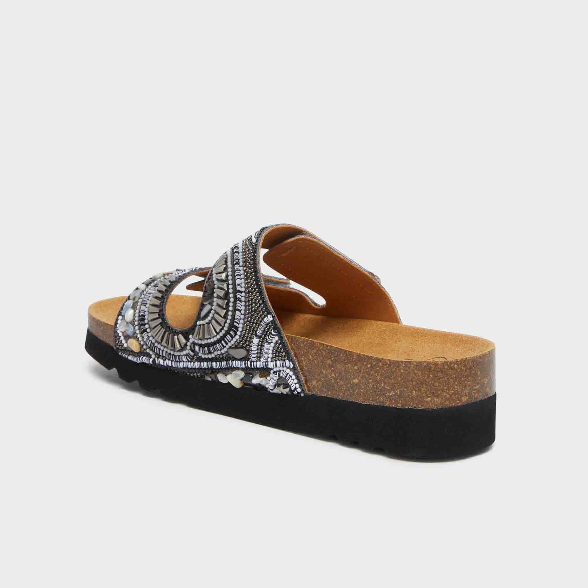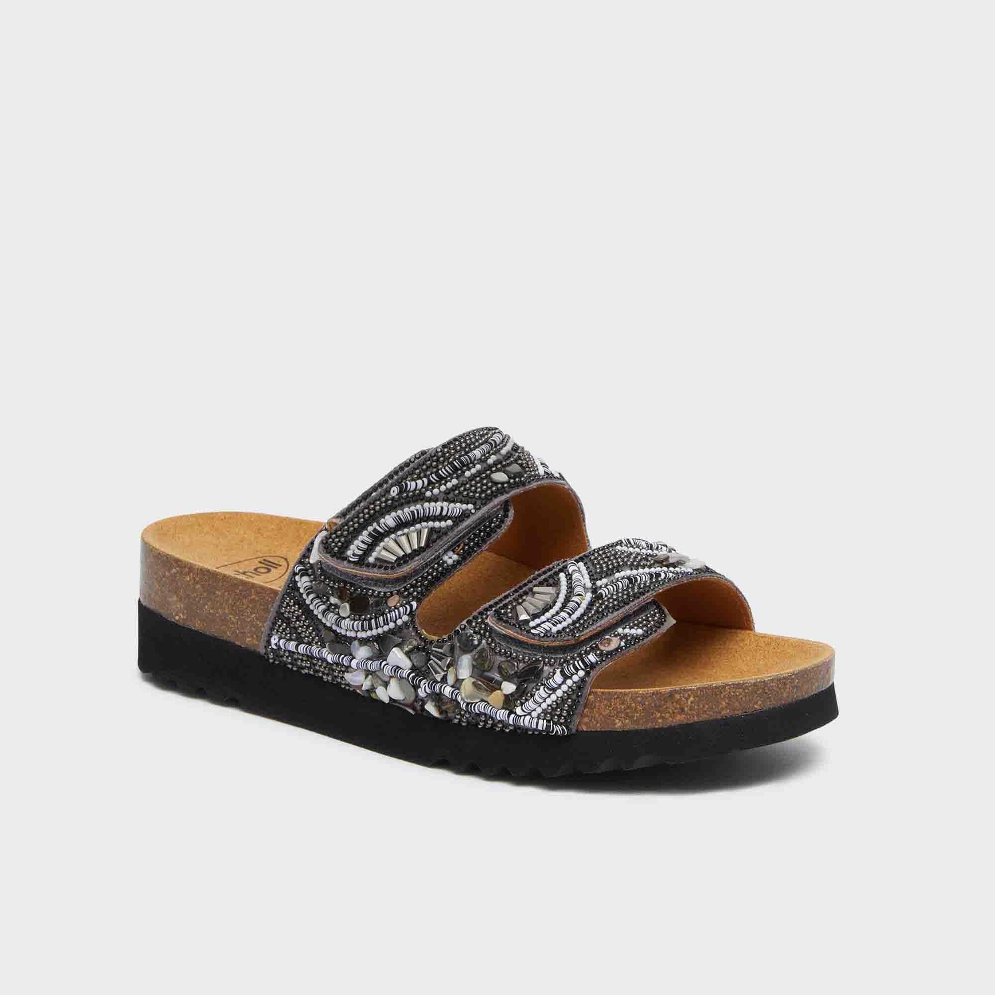 A women’s sandal with an unconventional and captivating design, perfect for those seeking a mix of style and comfort. Featuring Bioprint® technology, it improves posture by supporting the arch, ensuring a comfortable and natural walk. The upper, made of microfiber and embellished with beads, includes two adjustable straps for a personalized and secure fit. Ideal for completing summer looks with a touch of originality and glamour.