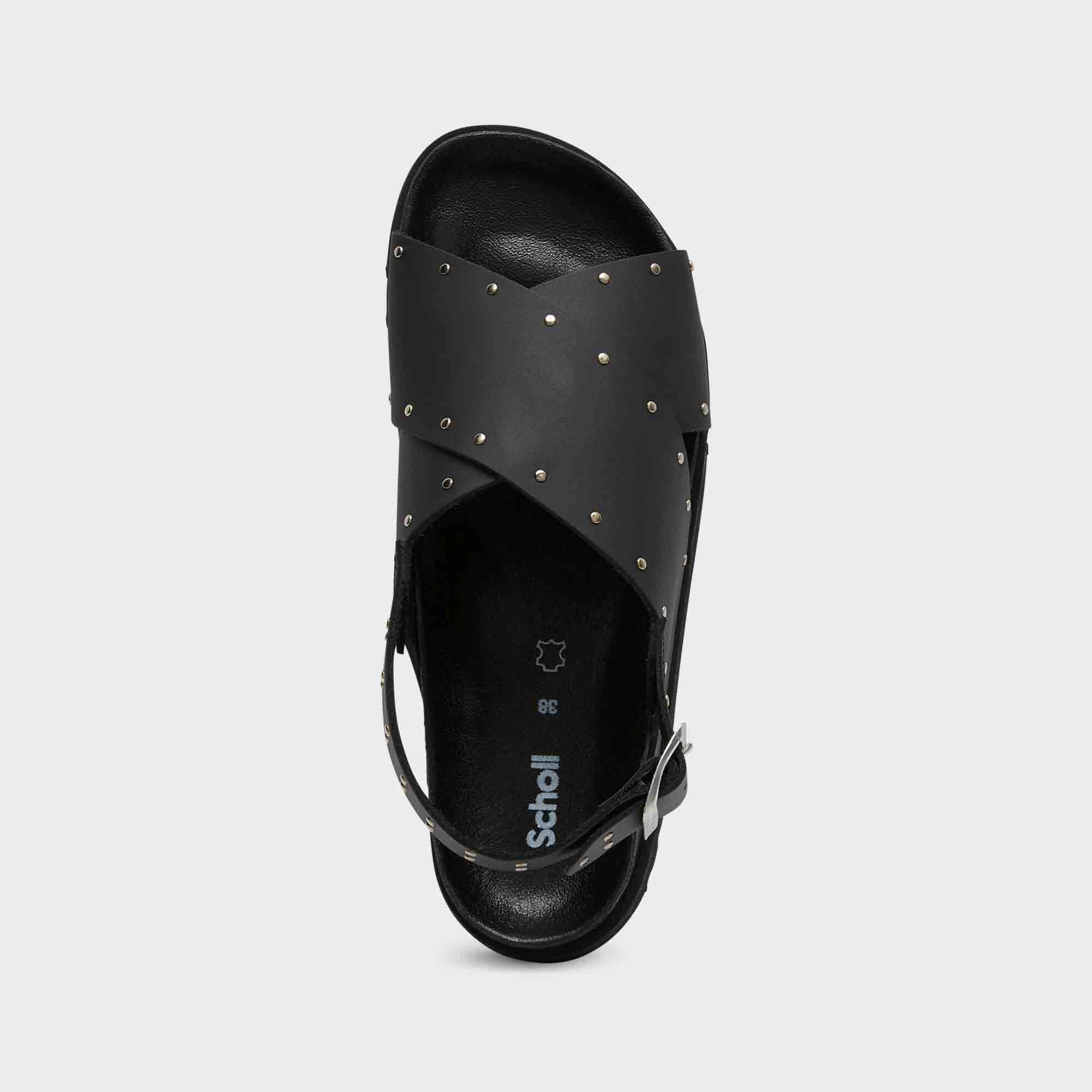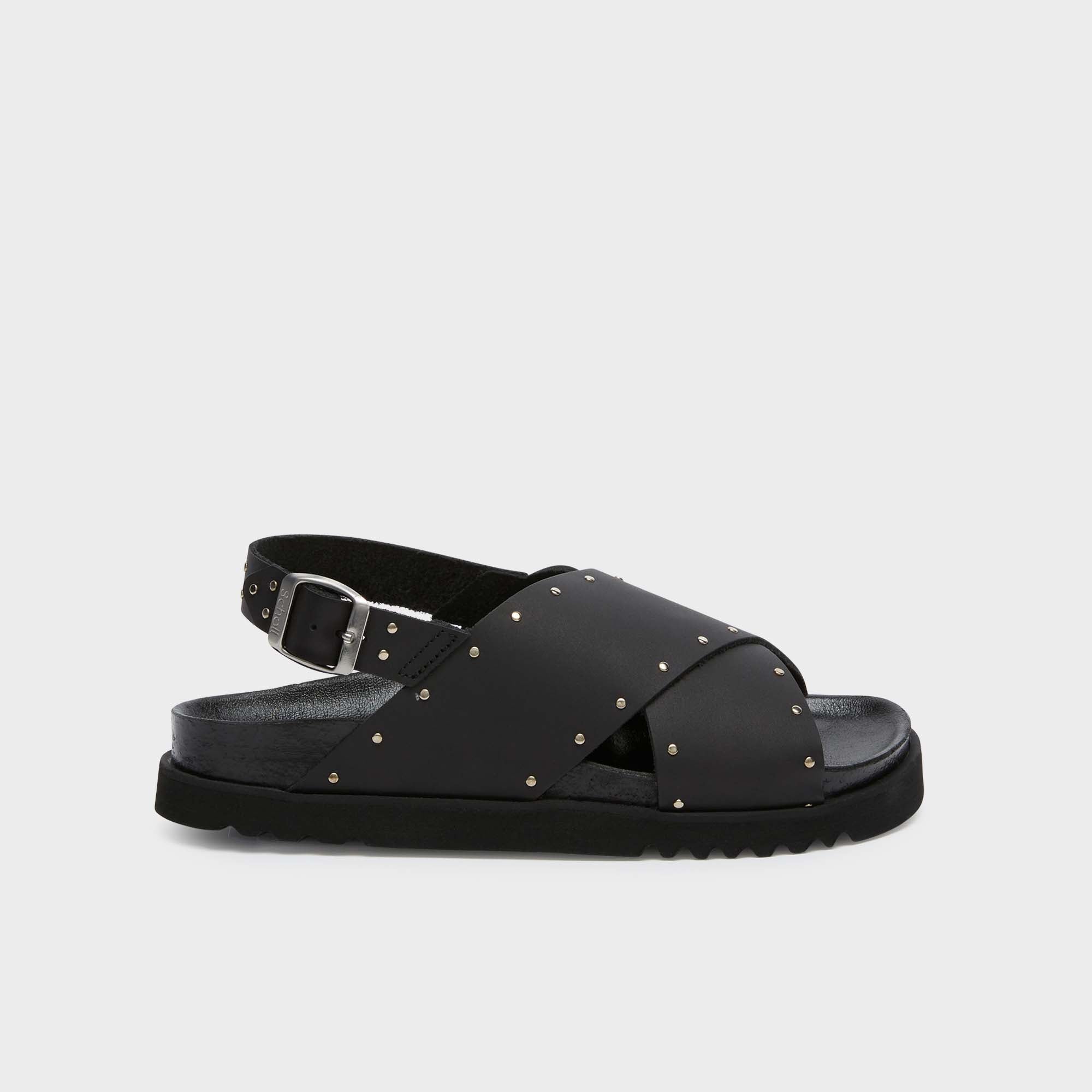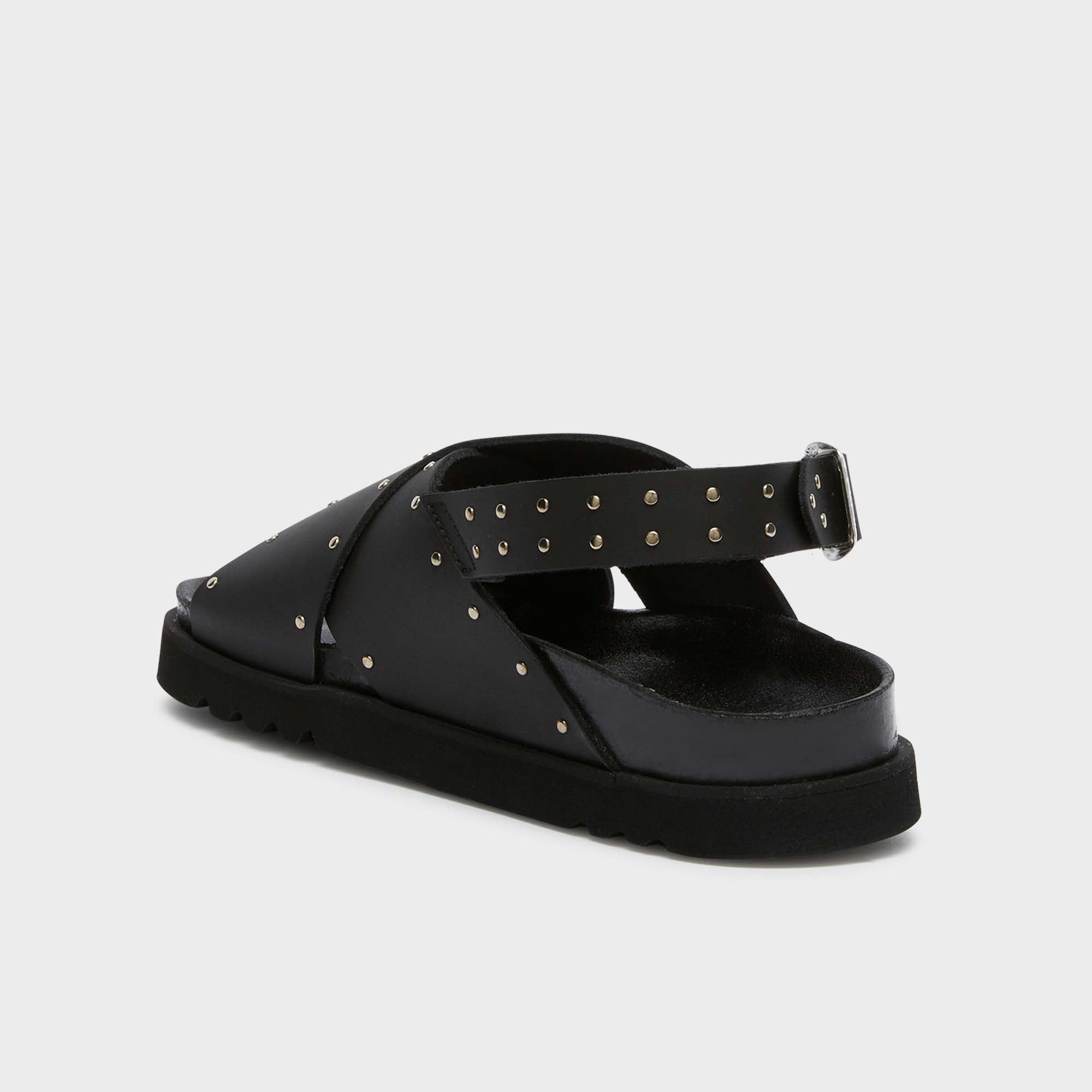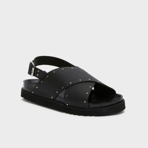 The Dalia sandal feature a bold cross-strap design, decorated with small metallic studs for a chic, modern look. The adjustable buckle ensures a secure fit, while the thick, textured sole provides excellent comfort and support.