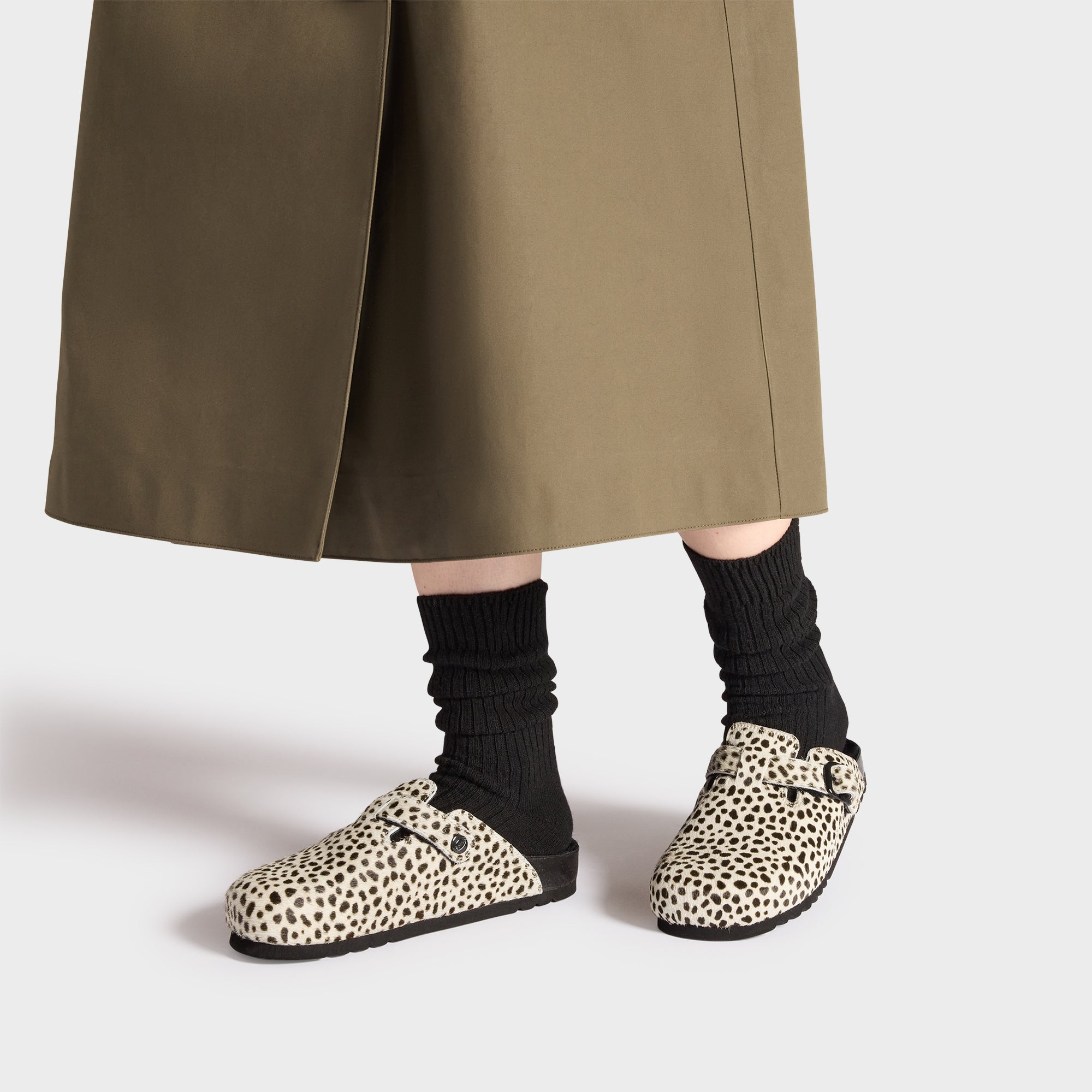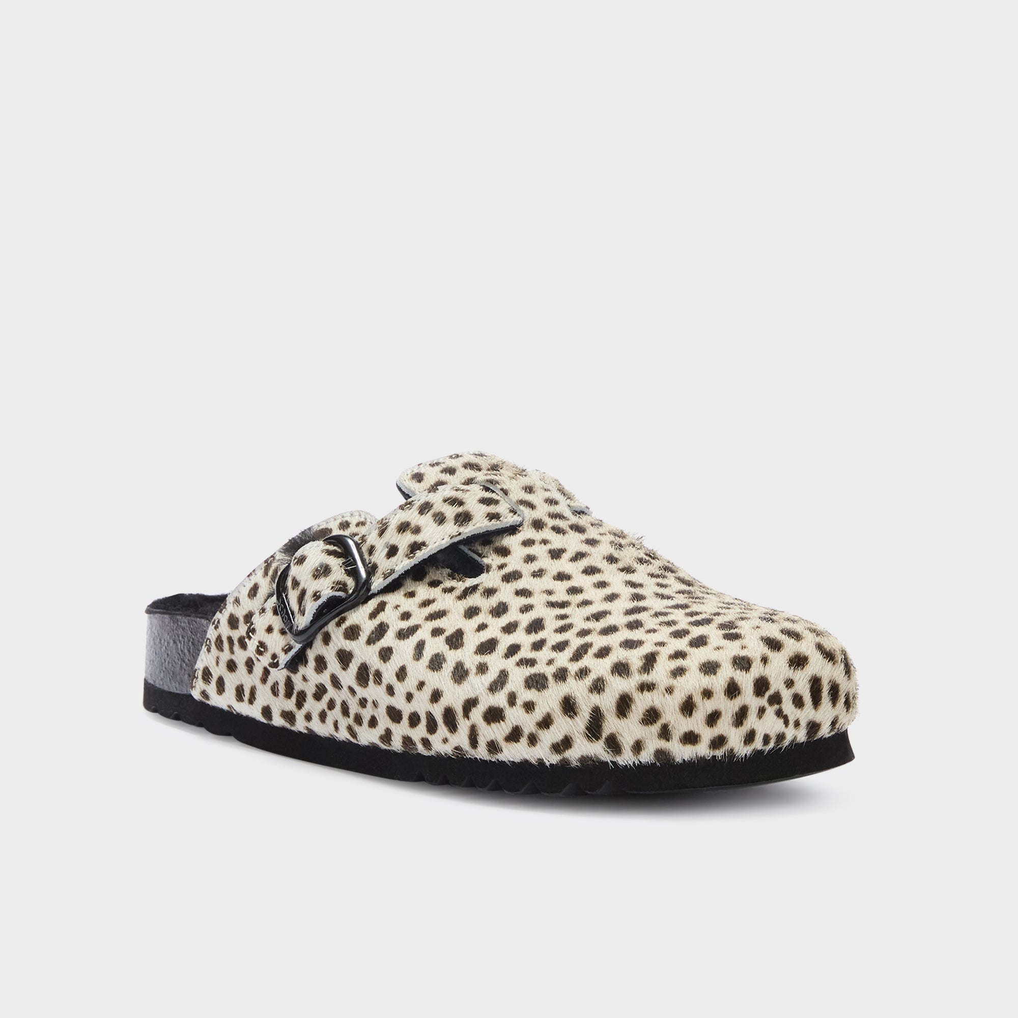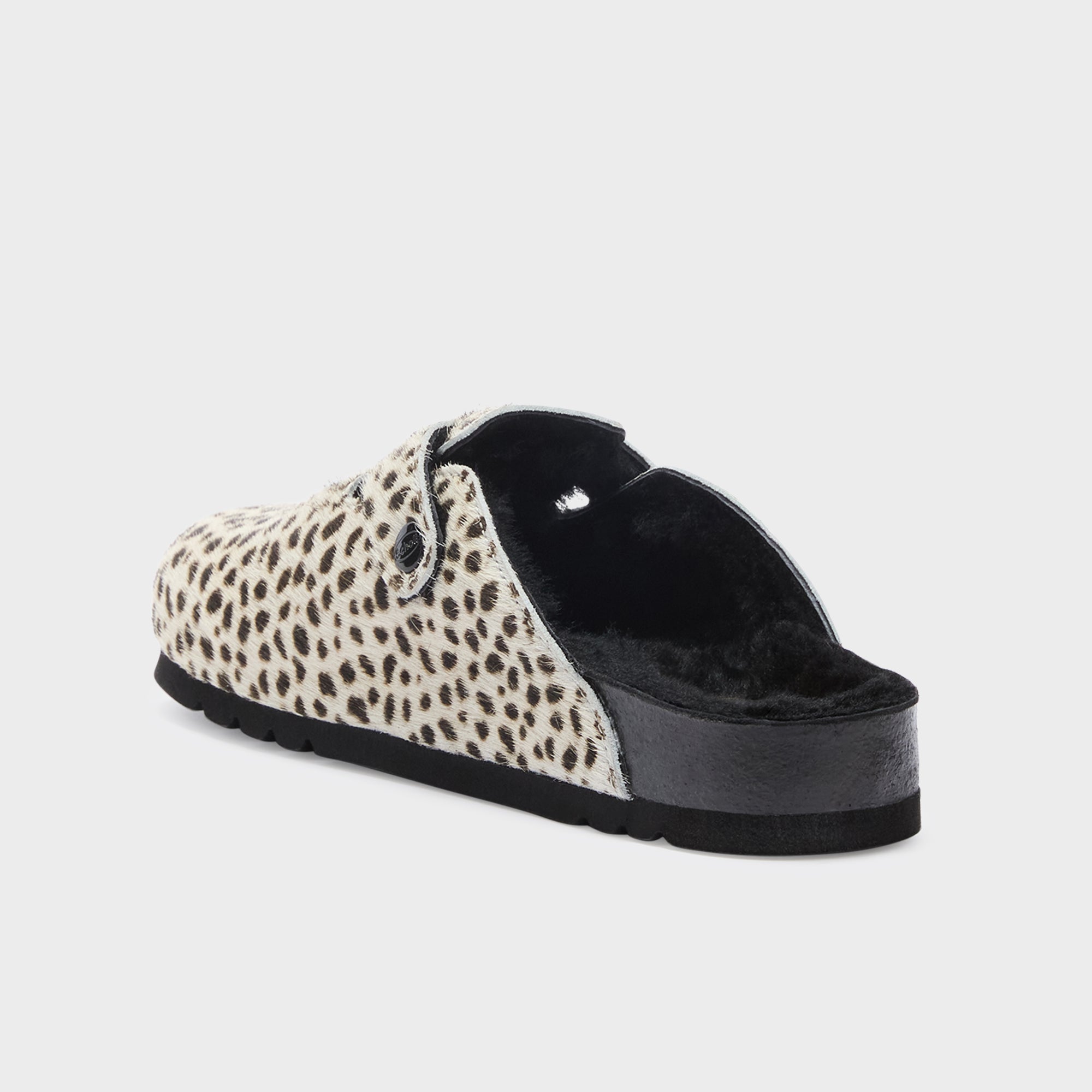Striking and full of character, this Scholl mule is crafted in genuine cow leather with a bold black and white spotted print. The pony-effect finish adds texture and uniqueness to the design, while the black metal buckle on the adjustable strap ensures a secure and personalized fit. Lined with soft shearling for added warmth and comfort, this model features a contoured footbed and a treaded rubber outsole for stability.