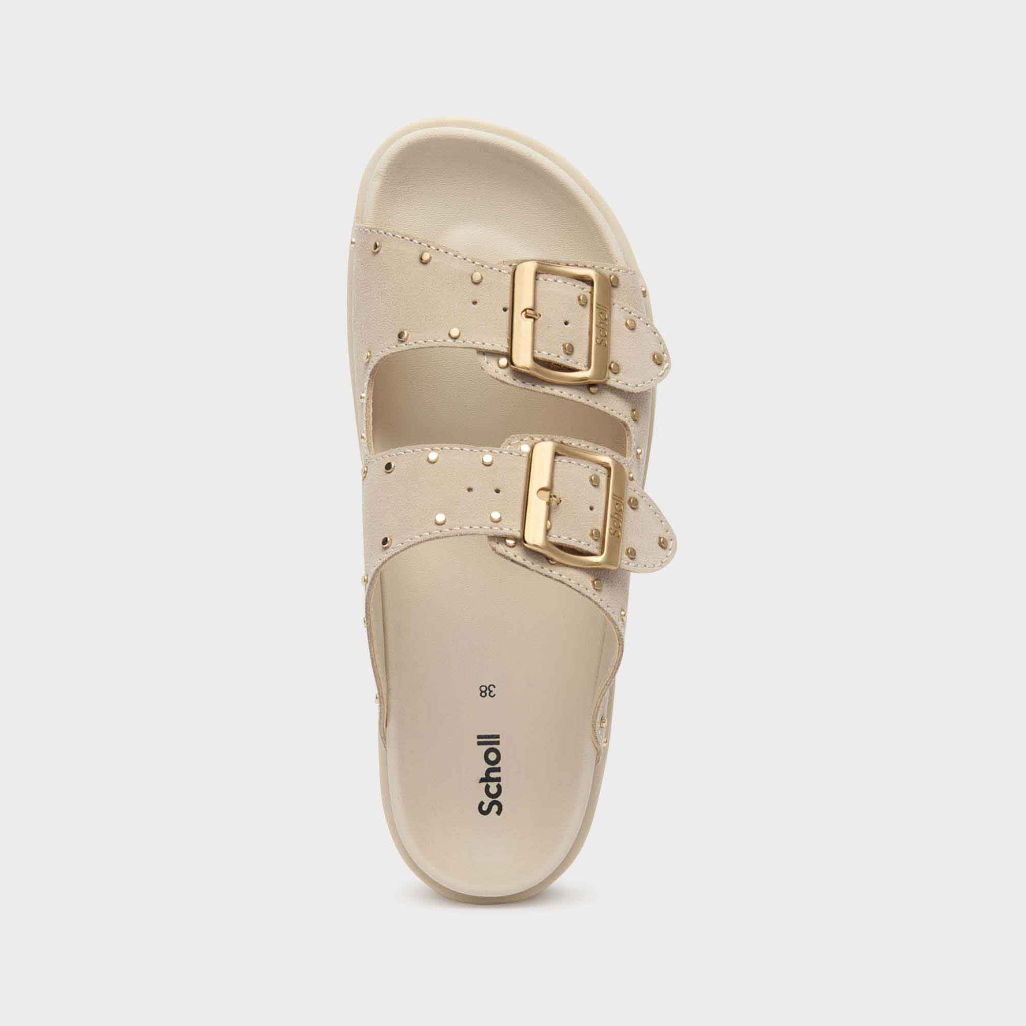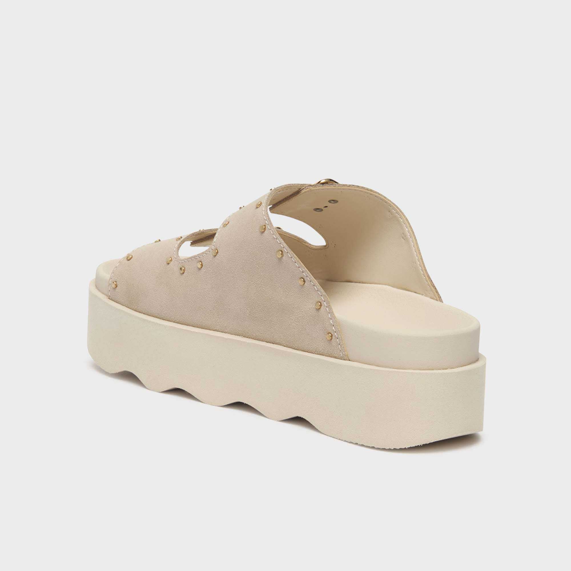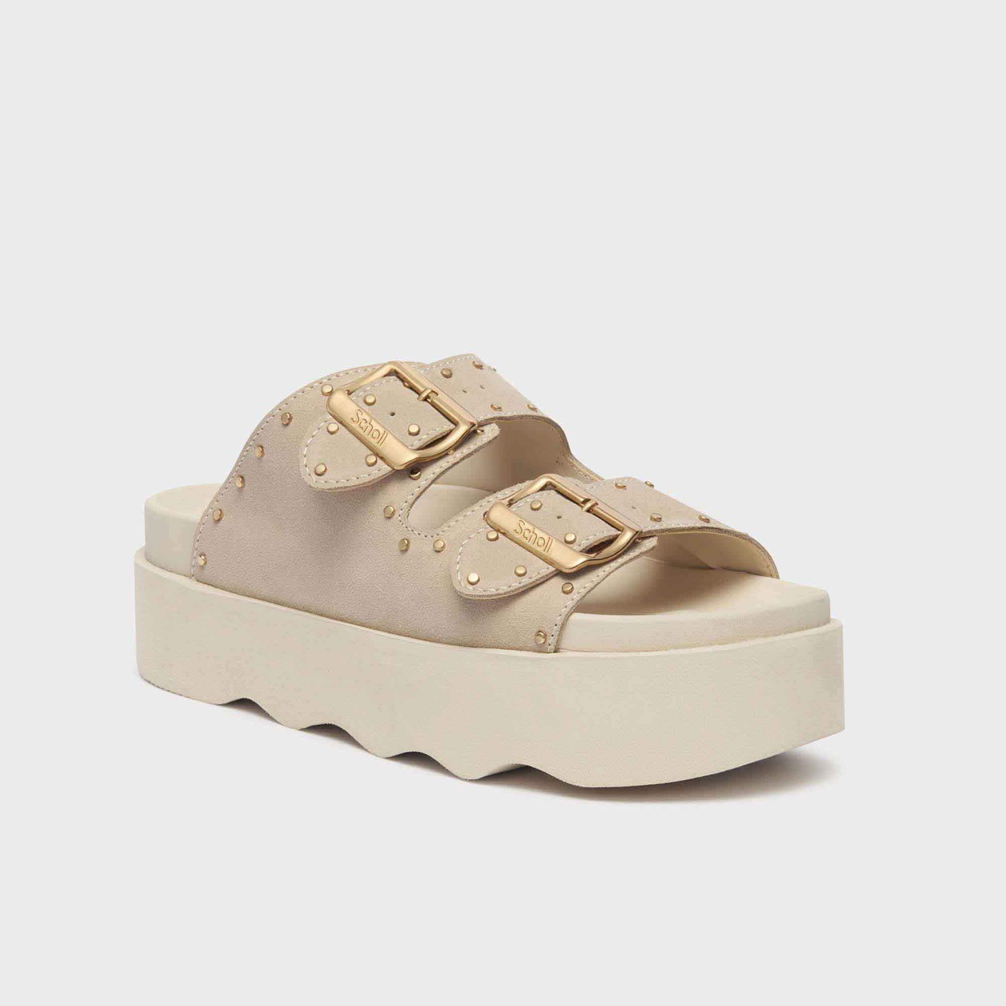 The Heather sandals showcase dual straps adorned with delicate metallic studs, adding a touch of edge to their chic design. Set on a comfortable platform sole, they’re finished with gold-tone adjustable buckles for a secure and customizable fit.
