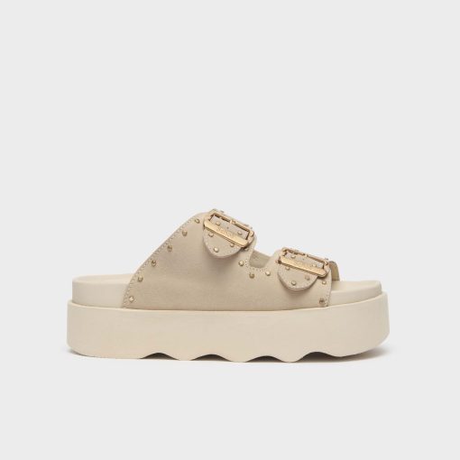 The Heather sandals showcase dual straps adorned with delicate metallic studs, adding a touch of edge to their chic design. Set on a comfortable platform sole, they’re finished with gold-tone adjustable buckles for a secure and customizable fit.