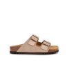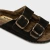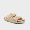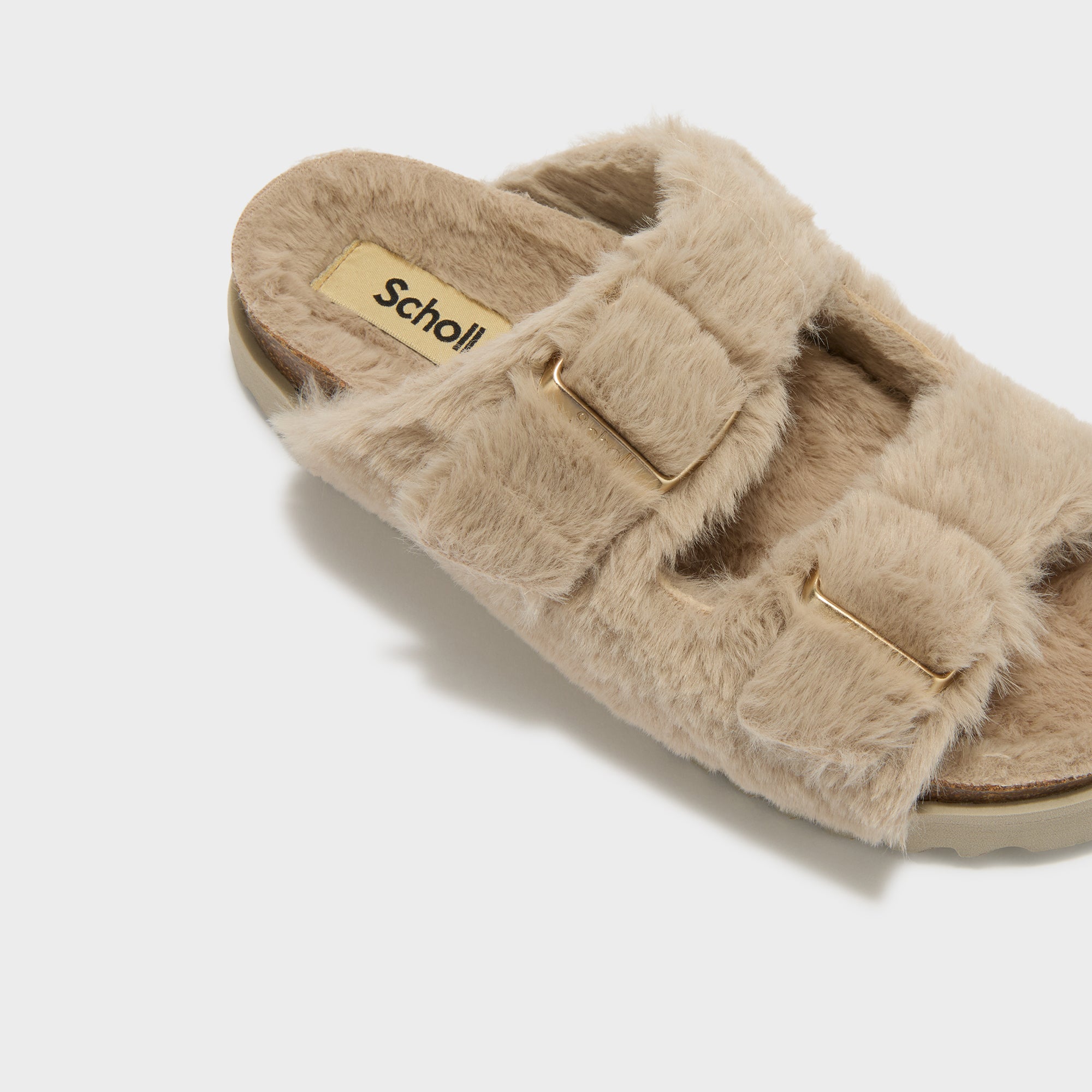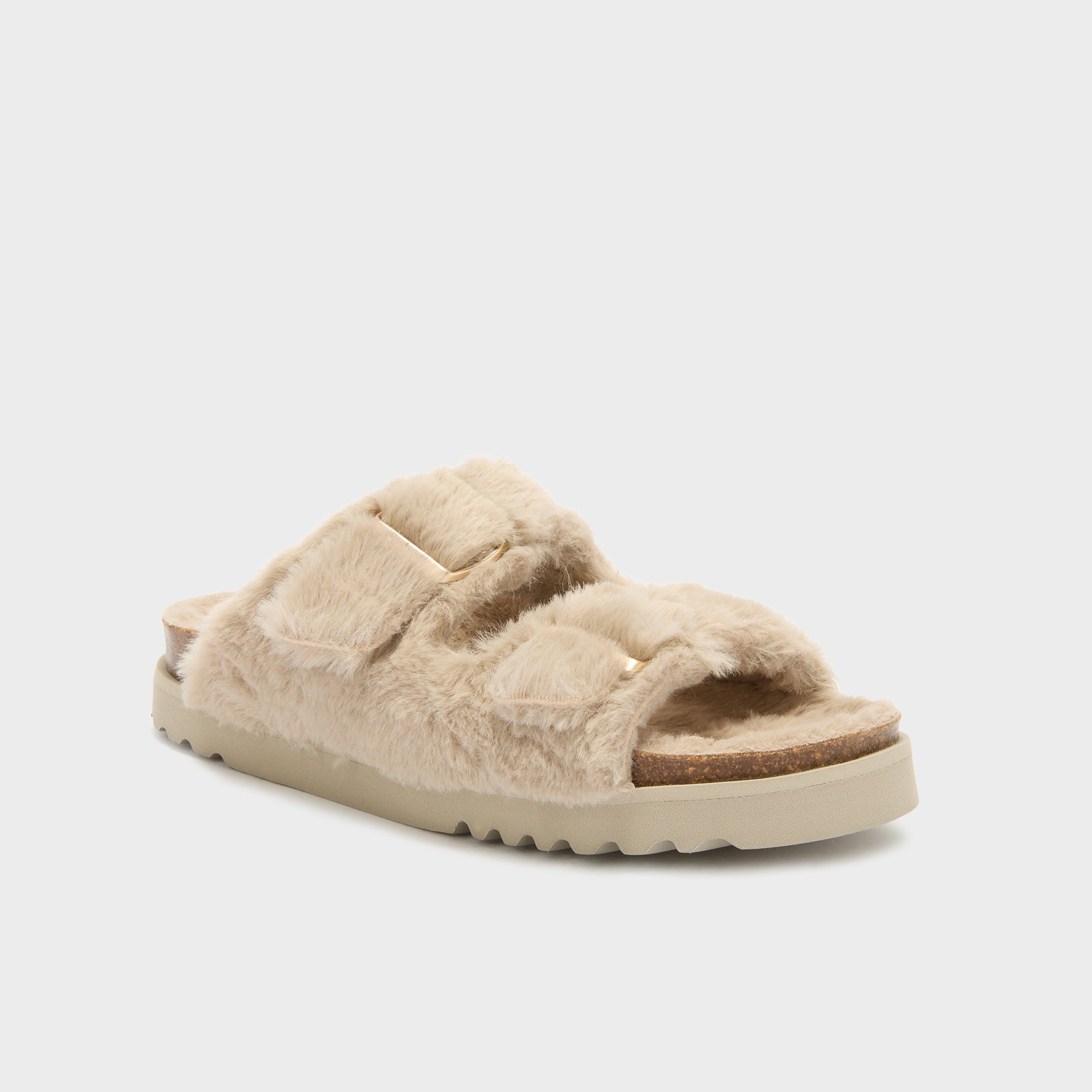 Open-toe sandal featuring soft faux fur and a bold, textured design. Completed with a comfortable sole and an adjustable strap with the iconic buckle. A cozy yet eye-catching style ideal for statement winter looks.