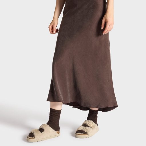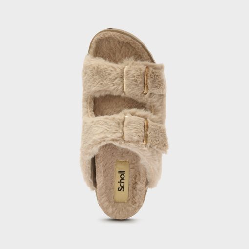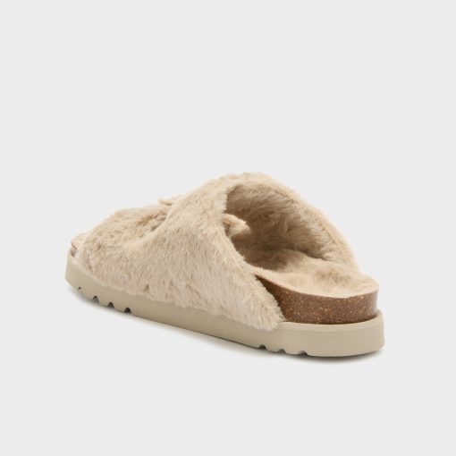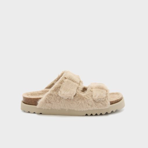 Open-toe sandal featuring soft faux fur and a bold, textured design. Completed with a comfortable sole and an adjustable strap with the iconic buckle. A cozy yet eye-catching style ideal for statement winter looks.