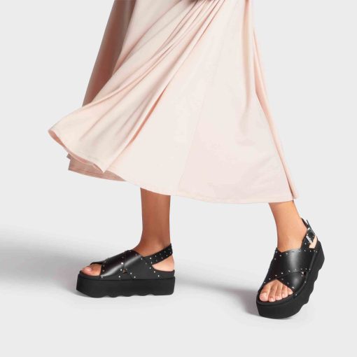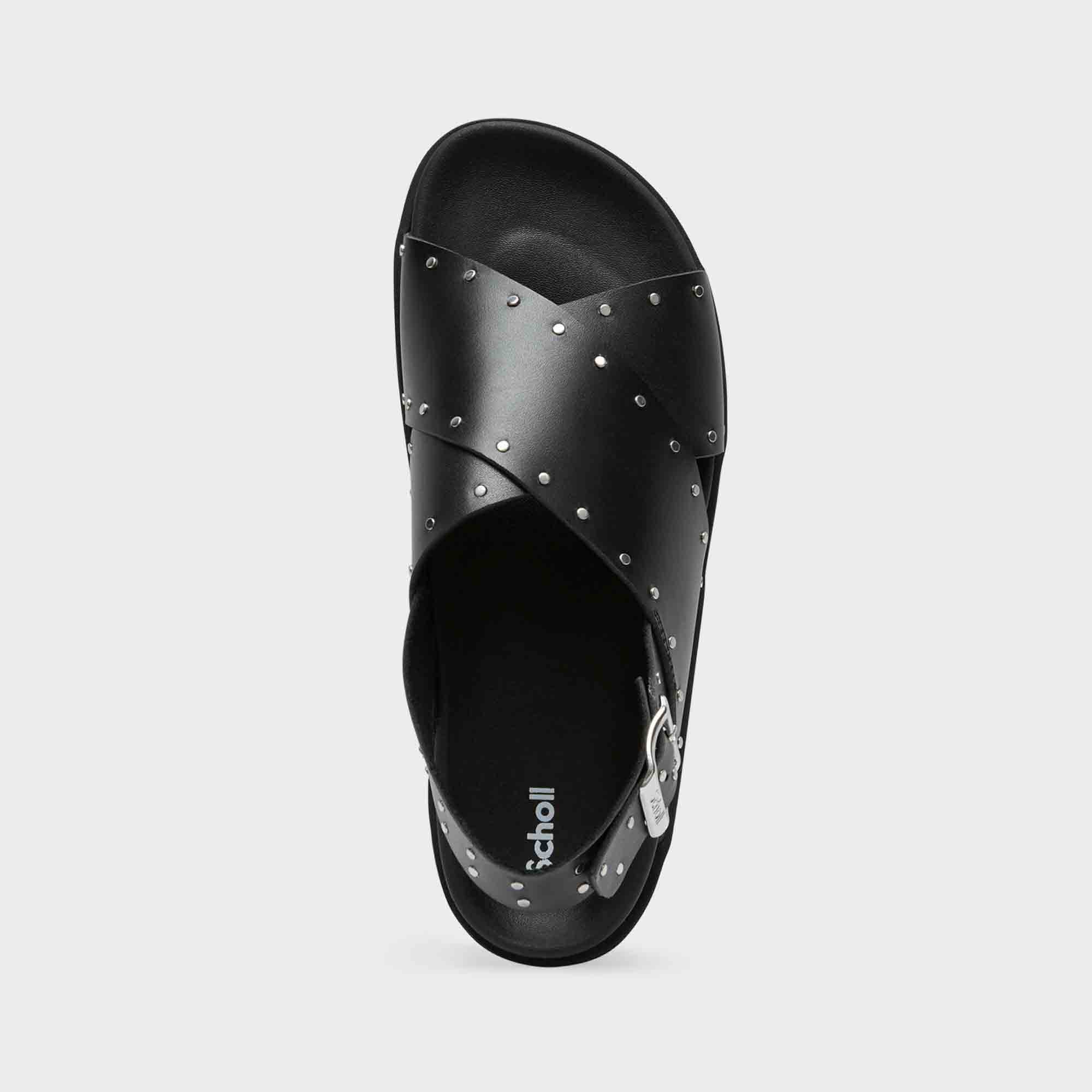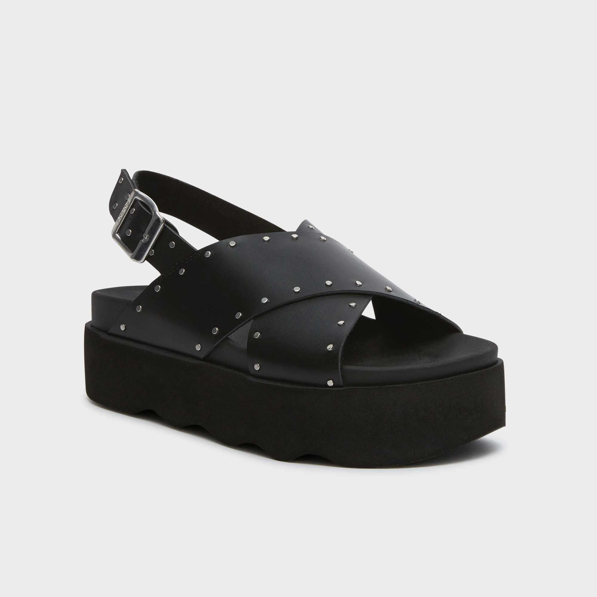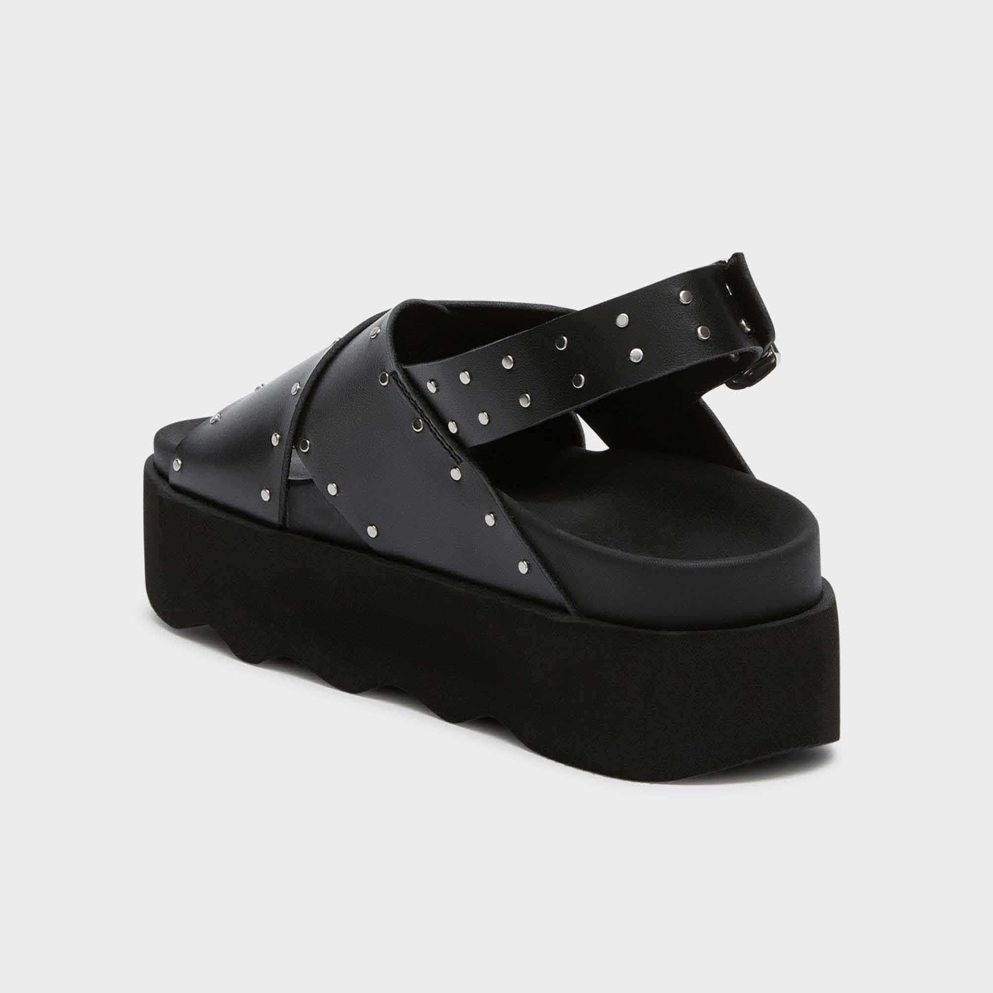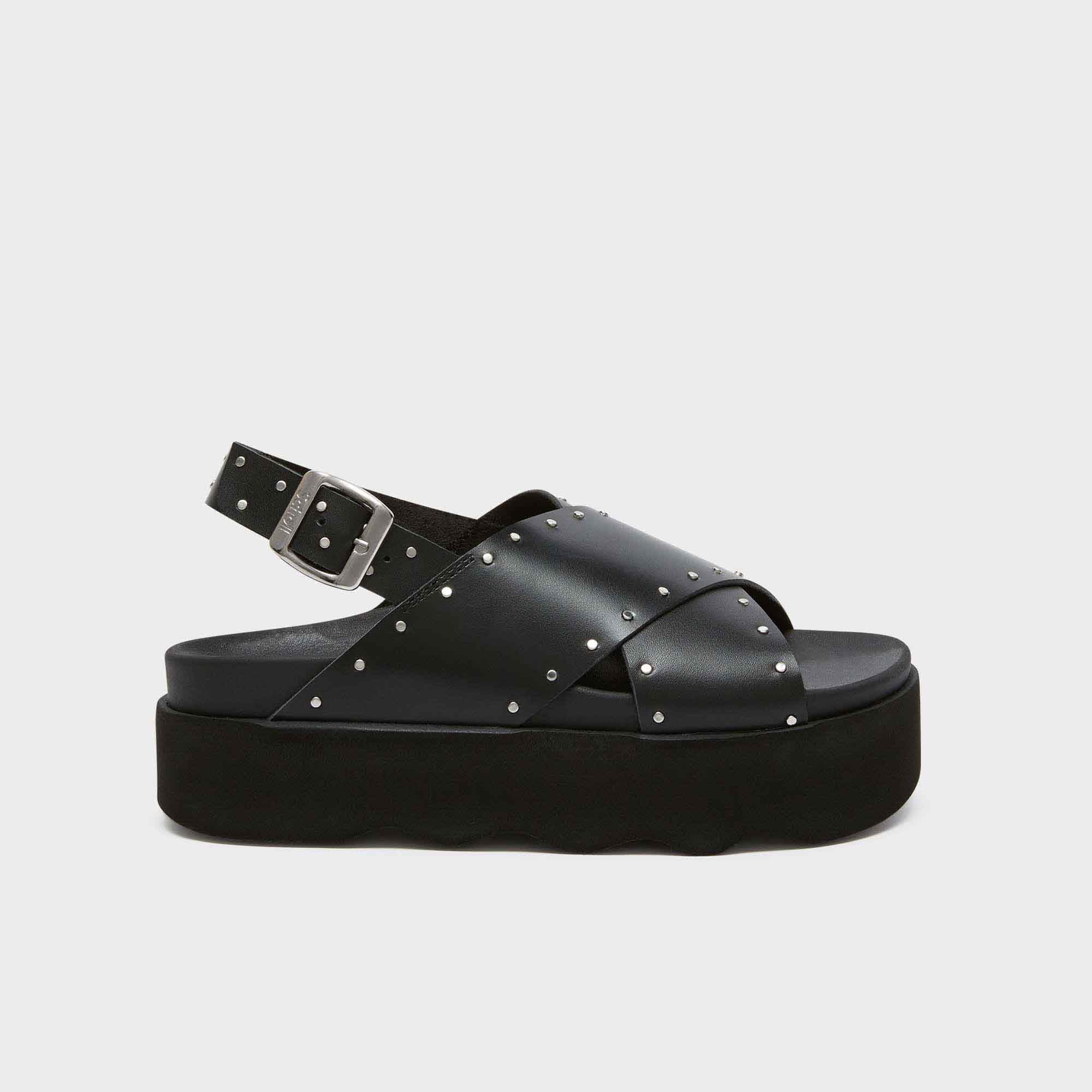 The Chantal sandals feature a chic cross-strap design, embellished with small metallic studs for a fashionable touch. With an adjustable buckle for a secure fit and a comfortable platform sole, these sandals offer both style and support,