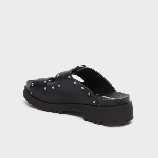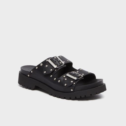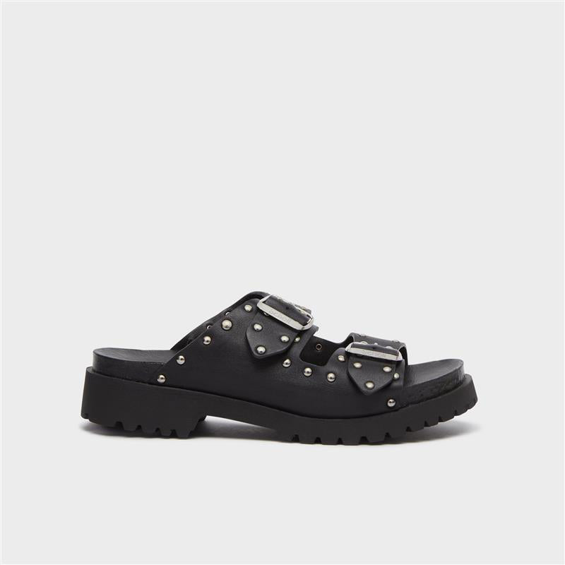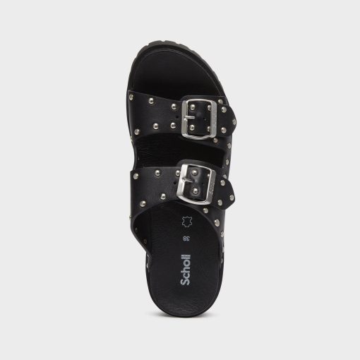 The Janet model from Scholl features a sturdy platform sole that provides stability and comfort. The all-black leather upper is adorned with silver studs and two adjustable buckles, offering an elegant and versatile look. Perfect for a chic outfit and all-day comfort.